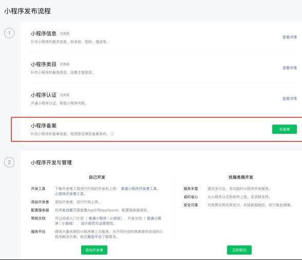開(kāi)發(fā)者可在小程序首頁(yè)點(diǎn)擊【去備案】即可進(jìn)入備案流程