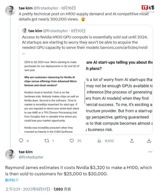 Tae Kim 表示,消息人士向投資銀行公司的 Raymond James 透露,H100 GPU 的成本為 3320 美元(IT之家備注:當前約 24236 元人民幣),而該公司以 25000 至 30000 美元(當前約 18.3 至 21.9 萬(wàn)元人民幣)的價(jià)格出售這些 GPU。