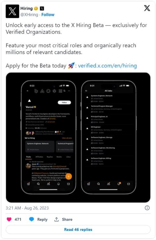 在私信中推出視頻聊天、語(yǔ)音聊天功能之后,X 今天宣布上線(xiàn) Beta 版 X Hiring 平臺,希望將其打造成為比肩 LinkedIn 的招聘平臺。