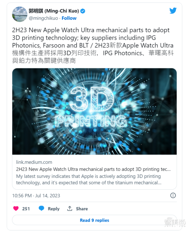 當然,沒(méi)有一家廠(chǎng)商采用新技術(shù)是為了增加成本。根據郭明祺爆料,他認為 3D 打印技術(shù)會(huì )降低蘋(píng)果 Apple Watch Ultra 鈦合金零部件的生產(chǎn)成本,同時(shí)對于蘋(píng)果達成一些綠色環(huán)保方面的目標會(huì )更加有利。