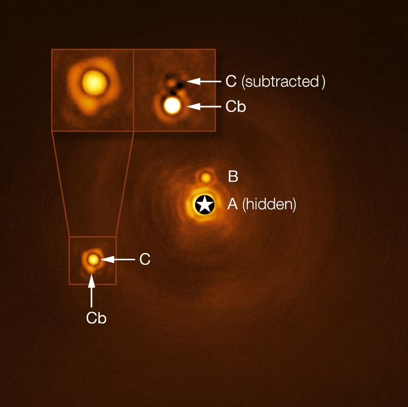 這項新的研究結果表明,該恒星系統中包含一顆圍繞恒星 C 運行的隱藏星 ——C b,屬于氣態(tài)巨行星,其質(zhì)量大約是木星的 14.8 倍,繞恒星一周大約需要 285.2 年,距離恒星約 23.04 個(gè)天文單位。