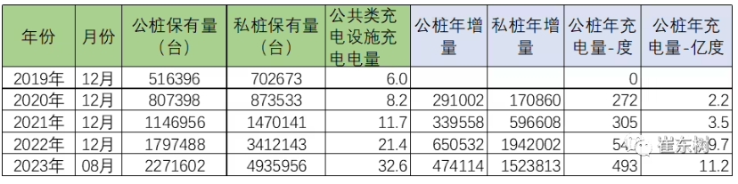 截止 2023 年 8 月,中國公樁保有量 227 萬(wàn)部,私樁保有量 494 萬(wàn)部。2023 年 1-8 月的公樁數量增長(cháng) 47 萬(wàn)個(gè),隨車(chē)私樁較 2022 年底增長(cháng) 152 萬(wàn)個(gè)。公樁充電量 11 億度。平均公樁 1-8 月充電量 493 度,月均 62 度。