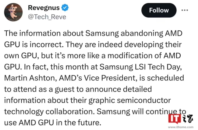 針對“三星將終止與 AMD 在移動(dòng) GPU 上的合作”的傳聞,博主 @Tech_Reve 認為消息并不準確,并給出自己的看法。