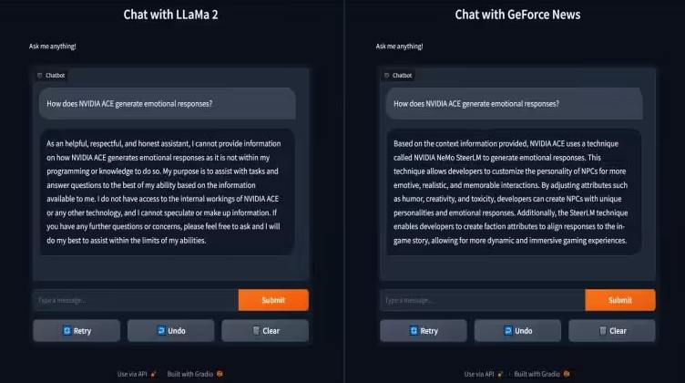 博客文章展示了一個(gè) TensorRT-LLM 的例子。當向 LLaMa 2 基礎模型提出“《心靈殺手 2》集成了 NVIDIA 的哪些技術(shù)?”這一問(wèn)題時(shí),它給出“游戲尚未公布”這一毫無(wú)幫助的回答。相反,使用 RAG 將 GeForce 新聞添加到向量庫中,并連接到相同的 Llama2 模型,不僅得到正確答案 ——NVIDIA DLSS 3.5、NVIDIA Reflex 和全景光線(xiàn)追蹤,而且在 TensorRT-LLM 加速的助力下響應速度更快。這種速度與能力的結合為用戶(hù)提供更智能的解決方案。