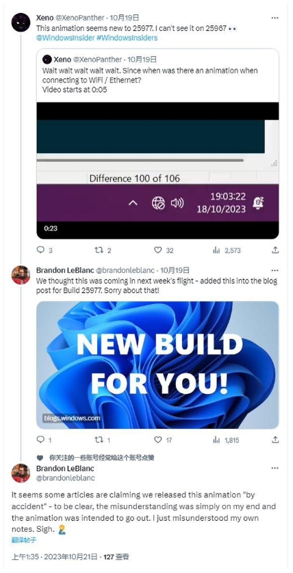Xeno 表示這個(gè)動(dòng)畫(huà)僅出現在 Build 25977 預覽版中,并未在 Build 25967 預覽版中存在。微軟的 Brandon LeBlanc 隨后證實(shí)了這一添加,并指出他認為該功能計劃于下周發(fā)布。