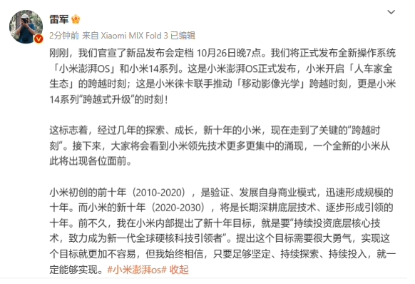 在小米官宣新品發(fā)布會(huì )定檔 10 月 26 日晚 7 點(diǎn)之后不久,小米創(chuàng )始人雷軍發(fā)文稱(chēng),此次發(fā)布會(huì )將是小米澎湃 OS 正式發(fā)布、小米開(kāi)啟“人車(chē)家全生態(tài)”的跨越時(shí)刻,也是小米徠卡聯(lián)手推動(dòng)“移動(dòng)影像光學(xué)”的跨越時(shí)刻,更是小米 14 系列“跨越式升級”的時(shí)刻。