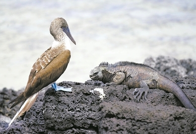 這是在厄瓜多爾加拉帕戈斯群島的圣克魯斯島上拍攝的藍腳鰹鳥(niǎo)和海鬣蜥。由于動(dòng)植物種類(lèi)極其豐富,加拉帕戈斯群島有“活的生物進(jìn)化博物館和陳列室”之稱(chēng)。