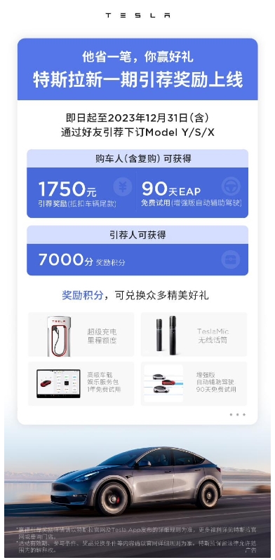 特斯拉推出新一期引薦獎勵:購車(chē)尾款抵扣 1750 元、EAP 免費試用 90 天等 09:43:39