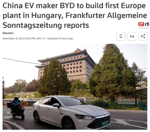 據路透社報道,德國報紙《法蘭克福匯報》發(fā)文,比亞迪計劃在匈牙利建設其第一家歐洲汽車(chē)工廠(chǎng),未透露姓名的消息人士表示,這一決定已經(jīng)在內部做出。