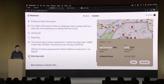另一個(gè)更加專(zhuān)業(yè)的演示則是OpenAI 的工作人員現場(chǎng)演示Assistants API的用法:它不僅能列出巴黎旅游建議,還能在地圖上將計劃中提到的地點(diǎn)按類(lèi)別標記出來(lái)。