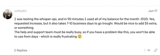開(kāi)發(fā)者zolika84在測試語(yǔ)音識別whisper-api時(shí),90分鐘就用掉了120美元額度