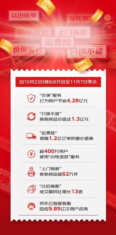 京東發(fā)文宣布,自 10 月 23 日晚 8 點(diǎn)至 11 月 7 日零點(diǎn),“一鍵價(jià)保”已為用戶(hù)節省 4.28 億元,“只換不修”換新商品價(jià)值達 1.3 億元,“運費險”已保障 1.2 億訂單,超 400 萬(wàn)用戶(hù)使用“閃電退款”服務(wù),“上門(mén)換新”換新商品超 62 萬(wàn)件,“以舊換新”成交額同比增長(cháng) 13 倍,京東云智能客服回應 9.89 億次用戶(hù)咨詢(xún)。
