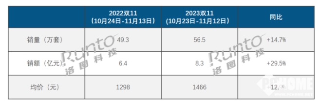 根據洛圖科技(RUNTO)最新的雙十一大促期中國智能門(mén)鎖市場(chǎng)總結來(lái)看,2023年雙十一大促期間,中國智能門(mén)鎖線(xiàn)上市場(chǎng)銷(xiāo)量為56.5萬(wàn)套,同比增長(cháng)14.7%;銷(xiāo)額為8.3億元,同比增長(cháng)29.5%;均價(jià)為1466元,比去年同期增長(cháng)168元。