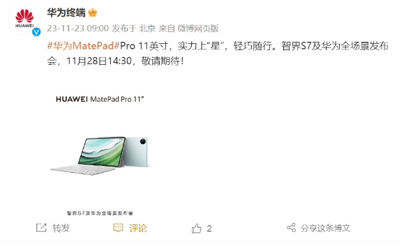 華為官方正式宣布,智界 S7 及華為全場(chǎng)景發(fā)布會(huì )將于 11 月 28 日 14:30 舉行。此次發(fā)布會(huì )上,除了已經(jīng)提前亮相的智界 S7 之外,華為還將帶來(lái)一款全新的平板產(chǎn)品。