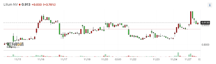 消息公布后,在納斯達克上市的Lilium股價(jià)一度跳漲超10%,最高報每股0.970美元?,F漲幅收窄至3.70%,報每股0.913美元。