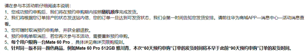 官方還特別指出,針對同一版本同一顏色商品,例如 Mate 60 Pro 512GB 雅川青,本次“60 天預約申購”訂單的發(fā)貨時(shí)間將不早于此前“90 天預約申購”訂單的發(fā)貨時(shí)間。