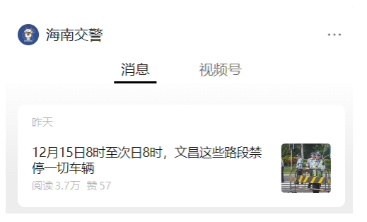 “海南交警”公眾號昨日發(fā)布消息:為確保文昌火箭飛行任務(wù)期間我省有關(guān)區域道路交通安全、暢通、有序,海南省公安廳交通警察總隊決定,對文昌航天發(fā)射基地周邊道路及通往文昌的道路實(shí)施交通管制。