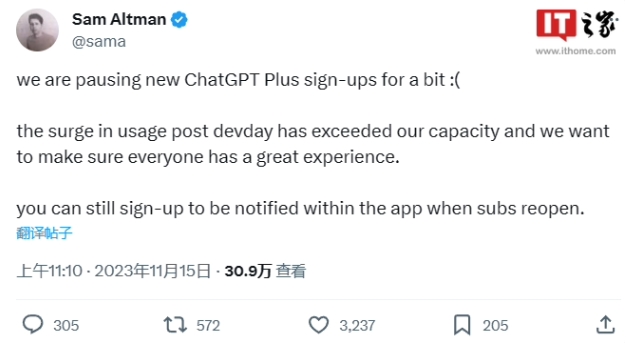 OpenAI 首席執行官 Sam Altman 在 X 平臺發(fā)文稱(chēng),將暫停 ChatGPT Plus 新用戶(hù)注冊。“開(kāi)發(fā)日后使用量的激增超出了我們的承受能力,我們希望確保每個(gè)人都有良好的體驗。”