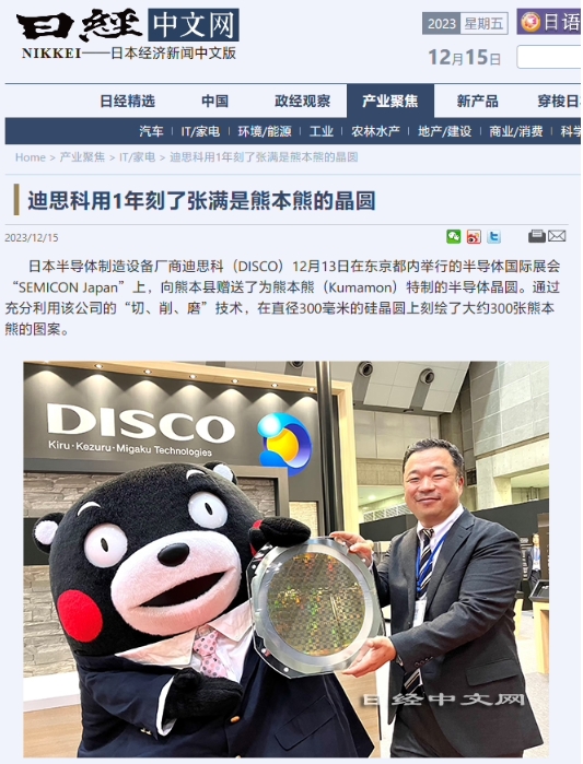 據日本經(jīng)濟新聞報道,日本半導體制造設備廠(chǎng)商迪思科(DISCO)日前在東京 SEMICON Japan 半導體國際展會(huì )期間,向熊本縣贈送了一塊特制的半導體晶圓。