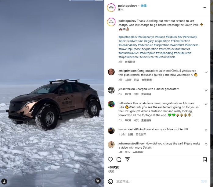 “Pole to Pole”(跨越極地)探險團隊北京時(shí)間今天早上發(fā)文宣布,今年 12 月 15 日,一對英國探險家夫婦于當地時(shí)間 12 月 15 日成功駕駛電動(dòng)汽車(chē)抵達南極洲,這是史上首輛跨越兩極的電動(dòng)汽車(chē)乃至所有汽車(chē)。