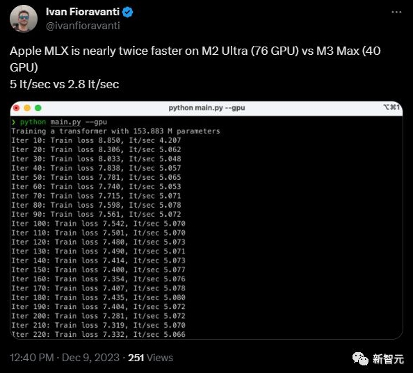 一位網(wǎng)友對 MLX 的速度進(jìn)行了測試,他在推文中表示,使用 Apple MLX 框架進(jìn)行計算的速度,M2 Ultra(76 個(gè) GPU)可達到每秒 5 次迭代(It/sec),而 M3 Max(40 個(gè) GPU)可以達到每秒 2.8 次迭代。