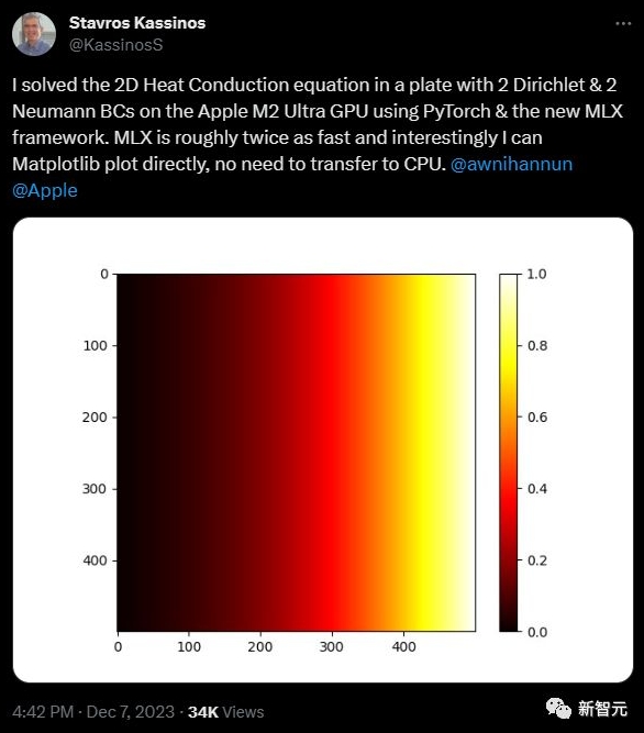 其他開(kāi)發(fā)人員也對于 MLX 進(jìn)行了其他有趣的嘗試,比如一位來(lái)自塞浦路斯大學(xué)的教授,在使用 PyTorch 和新的 MLX 框架的情況下,成功在 Apple M2 Ultra GPU 上解決了一個(gè)板上的二維熱傳導方程問(wèn)題,其中包含兩個(gè) Dirichlet 和兩個(gè) Neumann 邊界條件。