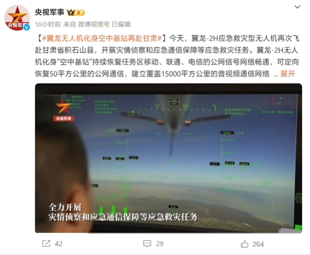 翼龍-2H 無(wú)人機再赴甘肅地震災區執行任務(wù):可定向恢復 50 平方公里公網(wǎng)通信 09:32:29