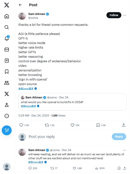 OpenAI 阿爾特曼曬網(wǎng)友新年愿望清單:通用人工智能(AGI)等呼聲最多