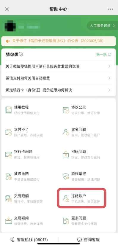 打客服電話(huà)95017轉9鍵,按提示操作就可以自助快速凍結微信支付賬戶(hù)。
