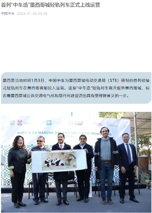 中國中車(chē)為墨西哥城電動(dòng)交通局(STE)研制的首列鉸接式輕軌列車(chē)在墨西哥首都投入運營(yíng),這是中國制造的輕軌列車(chē)首次服務(wù)墨西哥城公共交通系統。