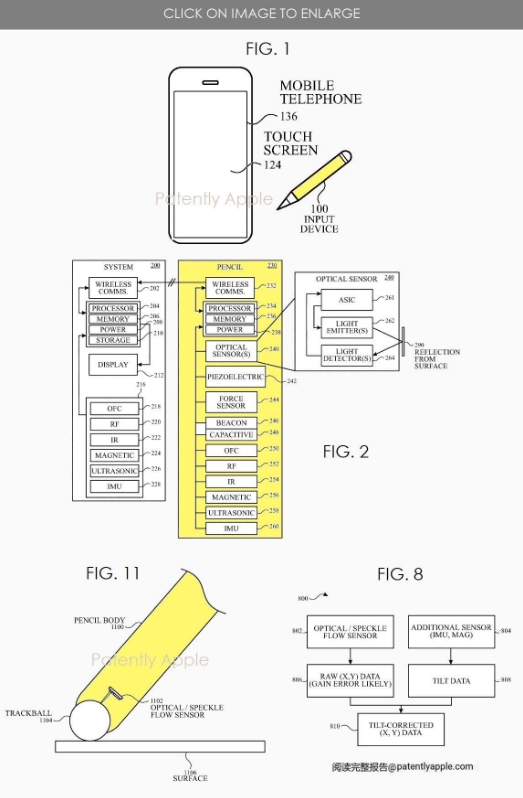 根據專(zhuān)利描述,新款 Apple Pencil 配有光學(xué)傳感器,可用于在不具備觸摸功能的表面上進(jìn)行交互。
