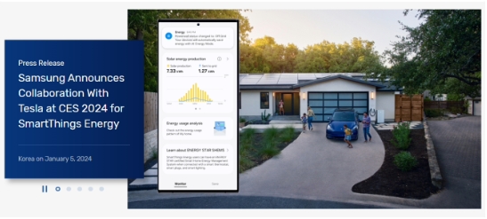 在 CES 2024 開(kāi)幕之前,三星官網(wǎng)發(fā)布新聞稿,宣布與特斯拉展開(kāi)智能家居合作。