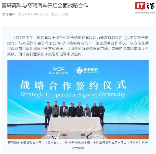 國軒高科與奇瑞開(kāi)啟全面戰略合作,共同開(kāi)拓新能源汽車(chē)市場(chǎng)