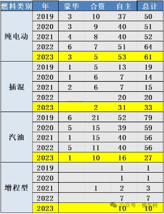 文章稱(chēng),近幾年的自主品牌新能源新品推出力度較強,2023 年純電動(dòng)推出 53 款,插混推出 31 款,增程式推出 10 款,總共 94 款。