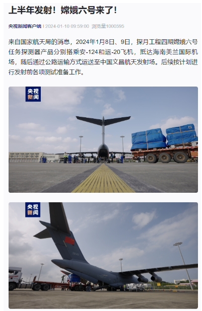 據央視報道,探月工程四期嫦娥六號任務(wù)探測器產(chǎn)品已分別搭乘安-124 和運-20 飛機抵達海南,后續按計劃進(jìn)行發(fā)射前各項測試準備工作。