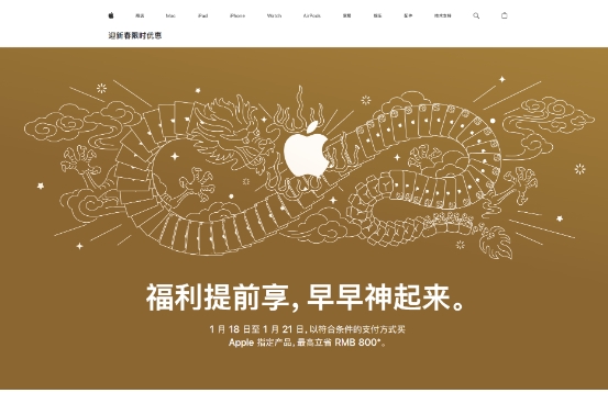 蘋(píng)果官網(wǎng)宣布將限時(shí)推出“新春優(yōu)惠”活動(dòng):從1月18日至1月21日,以符合條件的支付方式購買(mǎi)包括蘋(píng)果指定產(chǎn)品,即可獲得從50元到800元不等的降價(jià)優(yōu)惠。