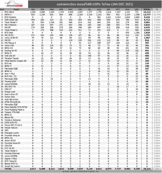 按品牌來(lái)統計的話(huà),泰國 2023 電動(dòng)汽車(chē)銷(xiāo)量排名為: