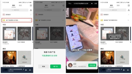 具體路徑:小程序下拉頁(yè)面-音樂(lè )-「看廣告免費聽(tīng)VIP音樂(lè )活動(dòng)」橫幅-看廣告即可。