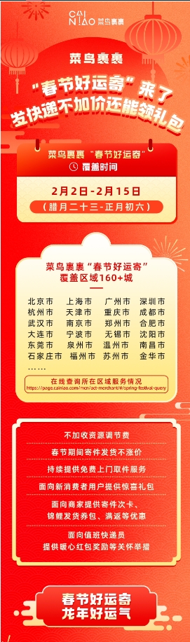 菜鳥(niǎo)宣布春節期間 160 余城正常提供快遞服務(wù),不加收資源調節費