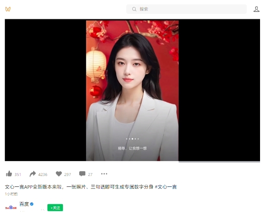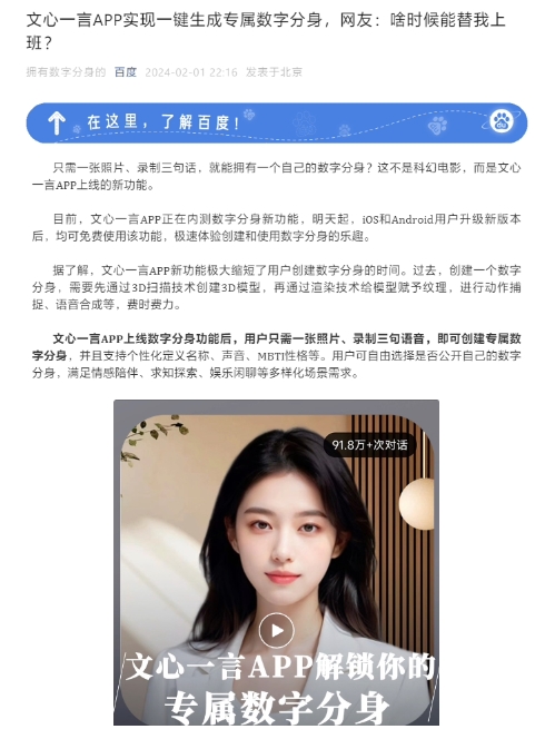 百度文心一言 App 將支持一鍵生成“數字分身”:一張圖、三句話(huà)即可創(chuàng )建