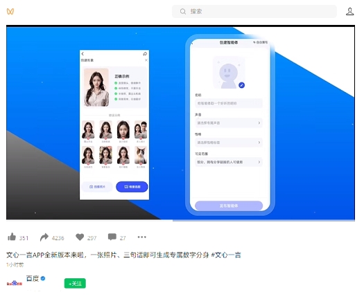 百度官方公眾號發(fā)文宣布,文心一言 App 正在內測數字分身新功能,iOS 和安卓用戶(hù)升級新版本 App 后,均可免費使用。