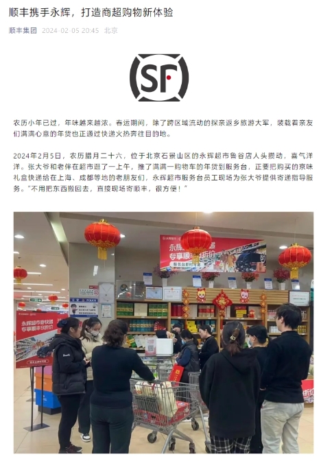為方便在超市購物的民眾寄送年貨,順豐與永輝在全國范圍內開(kāi)展合作,包括京津冀蒙魯、東三省、重慶、蘇皖、廣東、西藏等全國 26 省(市)、100 多個(gè)城市的 700 余家永輝超市服務(wù)臺均設立了順豐寄遞服務(wù)。