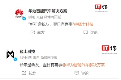 華為智能汽車(chē)解決方案、東風(fēng)猛士科技今日共同發(fā)布預熱微博:“新年逢新友,翌日有喜事”(翌日指明日)。