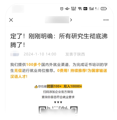 標題通過(guò)強烈煽動(dòng)性的表述“徹底沸騰了”來(lái)夸大事件的影響面,讓人誤以為是出臺了相關(guān)通知 / 政策,而正文實(shí)則是與標題描述不相符的培訓課程廣告。