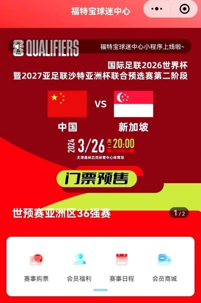 世界杯預選賽亞洲區36強賽中國隊主場(chǎng)對陣新加坡隊的比賽將于3月26日在天津奧林匹克體育中心體育場(chǎng)舉行,“福特寶球迷中心”小程序現已開(kāi)放球迷方陣實(shí)名購票預約,為龍之隊球迷會(huì )北看臺助威方陣和長(cháng)城球迷會(huì )南看臺助威方陣優(yōu)先開(kāi)通預約服務(wù)。