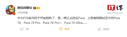 早些時(shí)候數碼博主 @數碼閑聊站 發(fā)帖稱(chēng),華為 Pura 系列手機在華為官網(wǎng)測試型號共有 4 種,分別是:Pura 70、Pura 70 Pro、Pura 70 Pro+、Pura 70 Ultra。