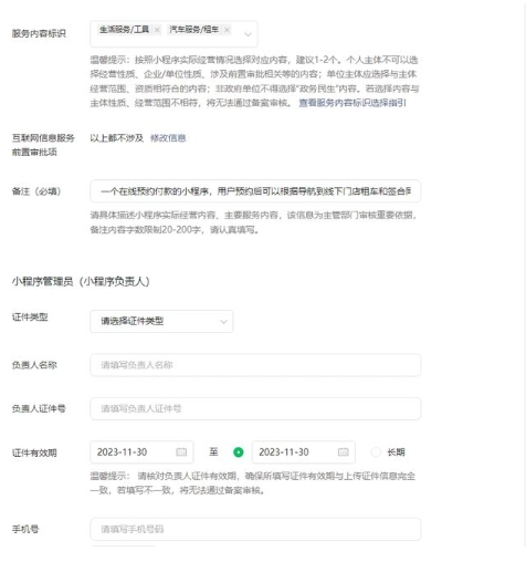 4、服務(wù)類(lèi)型標識一般選1個(gè),對于普通行業(yè)的前置審批選項,點(diǎn)開(kāi)下拉選擇“以上都不涉及”,備注說(shuō)明小程序類(lèi)型、功能和作用。