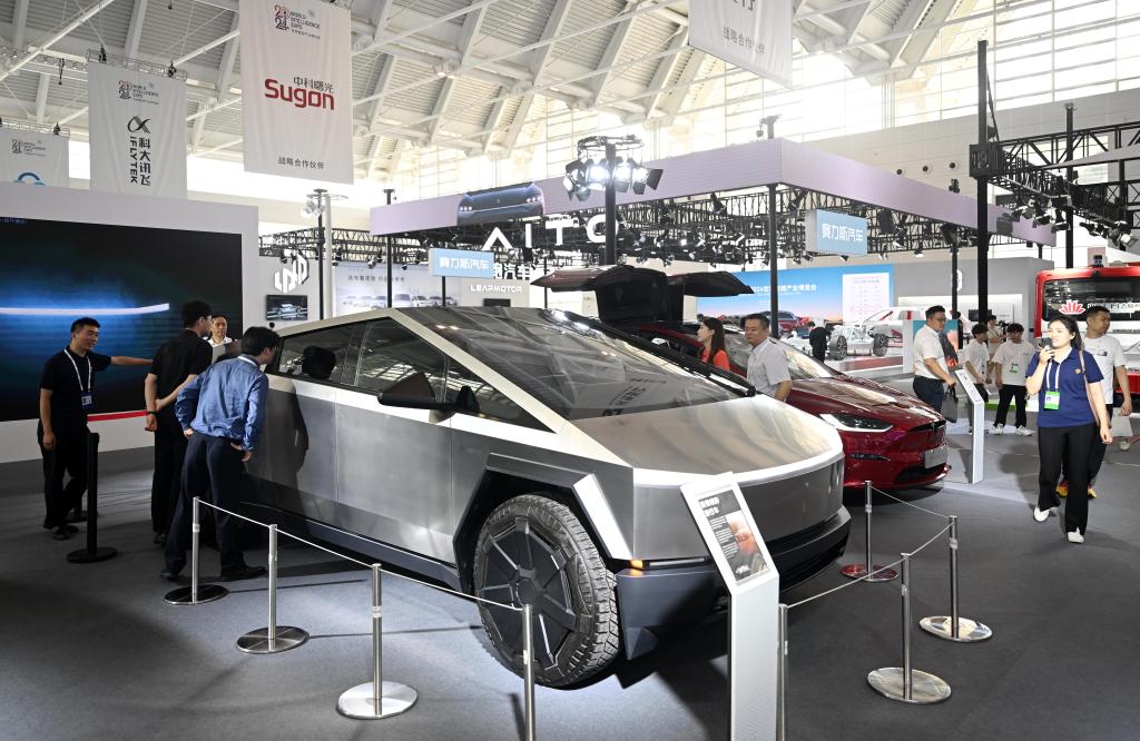 6月20日,參觀(guān)者在博覽會(huì )智能網(wǎng)聯(lián)汽車(chē)展區參觀(guān)特斯拉皮卡車(chē)。新華社記者 趙子碩 攝