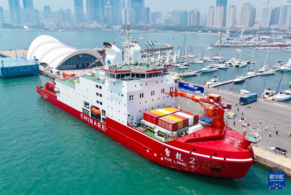 7月3日,“雪龍2”號極地科考破冰船靠泊在青島奧帆中心碼頭(無(wú)人機照片)。新華社發(fā)(張進(jìn)剛攝)