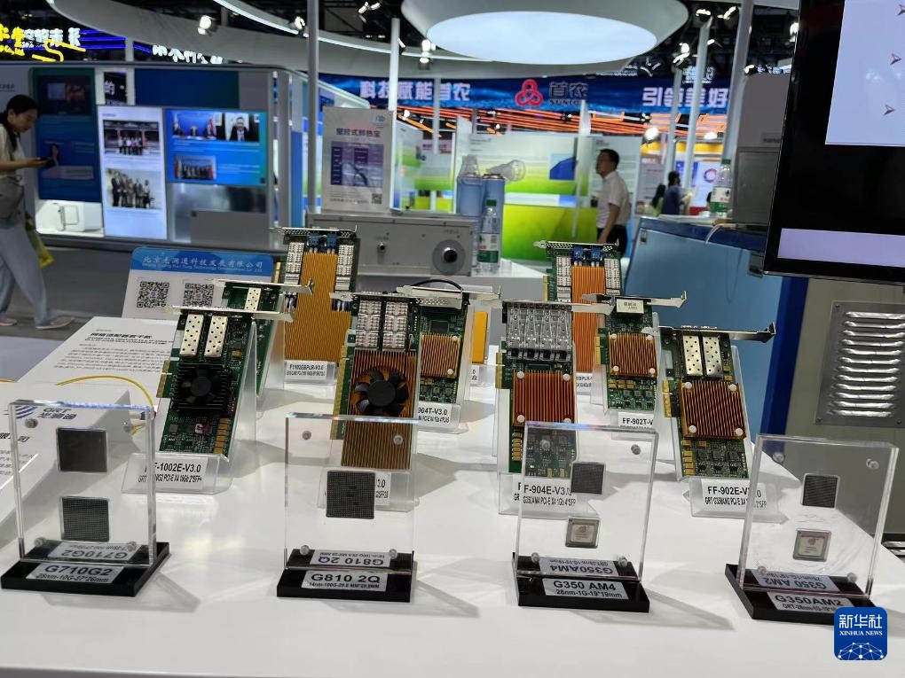 7月15日,在北京科博會(huì )上,企業(yè)展出的網(wǎng)卡、模塊和芯片等產(chǎn)品。新華社記者 陽(yáng)娜 攝